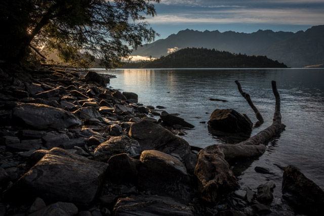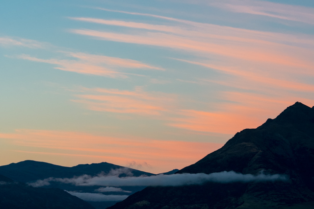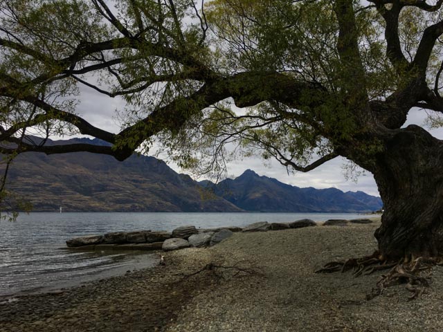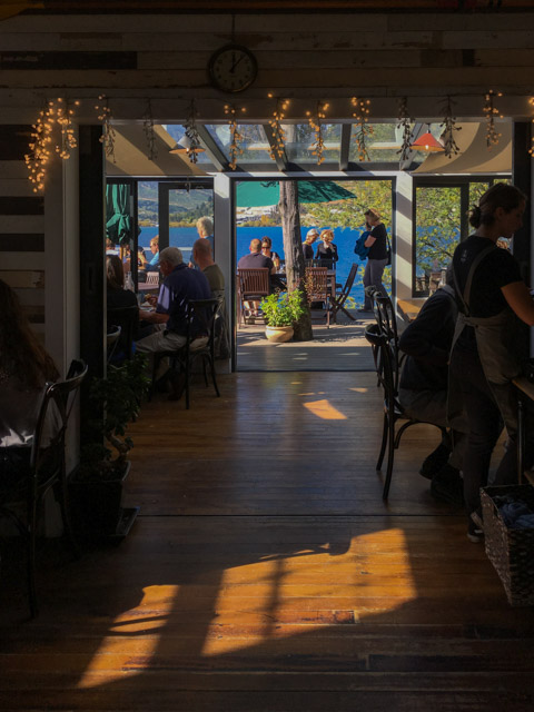 We arrived at our hotel about 1pm. Queenstown looked busy on the way through so we decided to have a late lunch in Glenorchy at the far end of the lake before looking for sites for our final sunset. Glenorchy Café does some really good food; we had Vege sandwiches – these came with rye bread, brie and lots of salad and roasted vegetables – very tasty! Our leader suggested that a place just down the road had amazing carrot cake; Florence went to investigate and returned with the last slice – it didn’t disappoint.