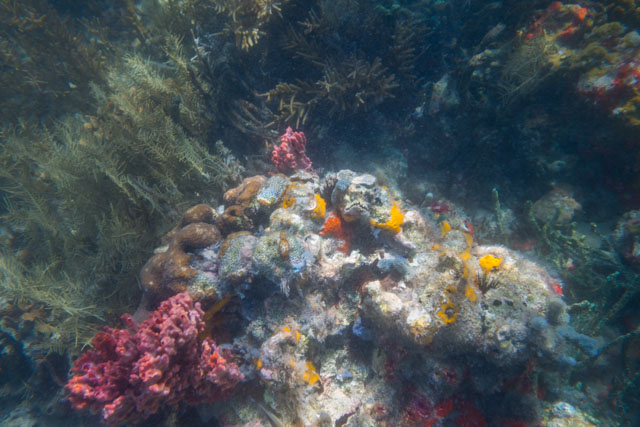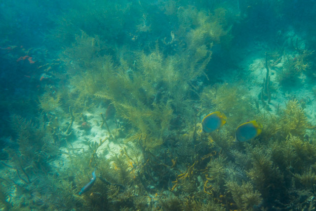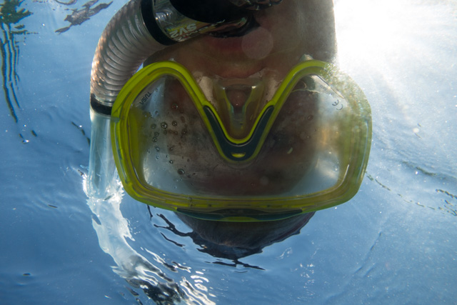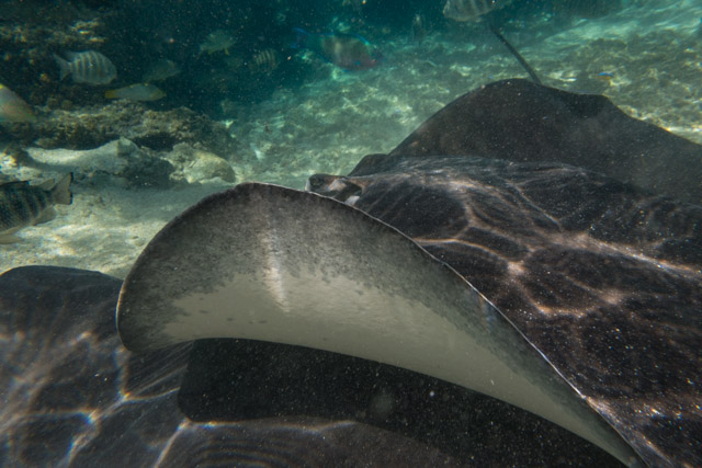 It was a short cruise to the snorkelling point, there was already a boat moored when we arrived. This was a snorkel with a difference, we stayed in one place, hanging onto to ropes slung between buoys while scraps of fish were thrown into the water to attract sharks and stingrays. This dubious practice was worsened by the encouragement to ‘ride’ the rays by grabbing their mouths from above and holding on while they swim off.