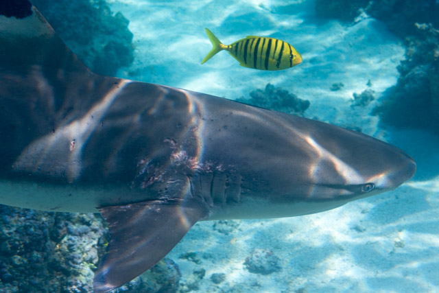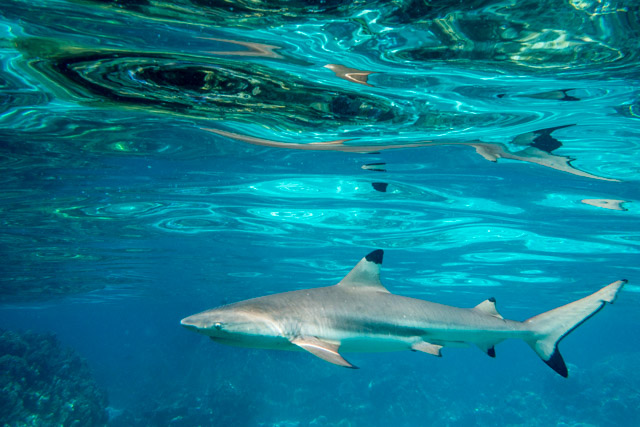 Once the feeding finished the majority of people lef, leaving us in peace to enjoy many many varieties of fish. The sharks and rays still hung around, it’s fascinating to see them close up – very close up. The sharks are blacktip reef sharks, about 1.6m long, they pose little threat to people. They are one of the commonest sharks in the Pacific, they mainly eat small fish and crustaceans as well as occasional birds.