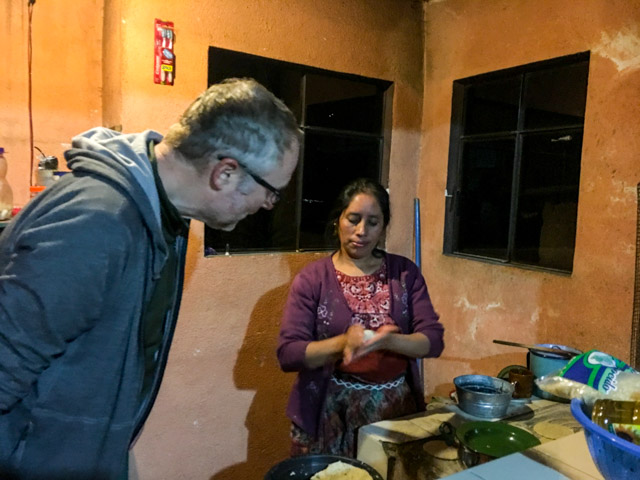 At 7am, we went up to the kitchen. Christiana was busy preparing our breakfast: omelettes, frijoles (black beans) and tortillas. Very welcome. All washed down with a cup of very sweet black coffee. Felipe, her husband, joined us. He is a fireman and starting at 8am, he was starting a 24 hour shift. We talked about the news (a lot of bad stuff happened in Guatemala City overnight). At 7.30am, we thanked them for their hospitality and got back to our meeting point.